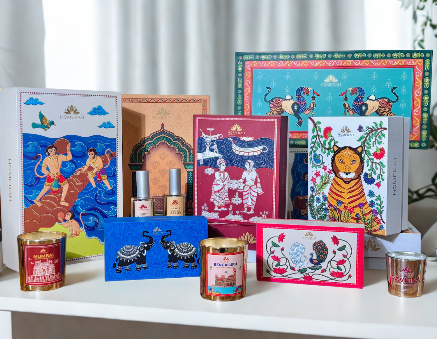 Bring the vibrant energy of India’s coasts into your home with Homerah’s Lights & Shores Collection, a curated set of three fragrances blending fine room parfum and scented soy wax luxury candles. Encased in a Gond Tiger-inspired gift box, this collection celebrates India’s artisanal heritage while creating an immersive sensory experience.