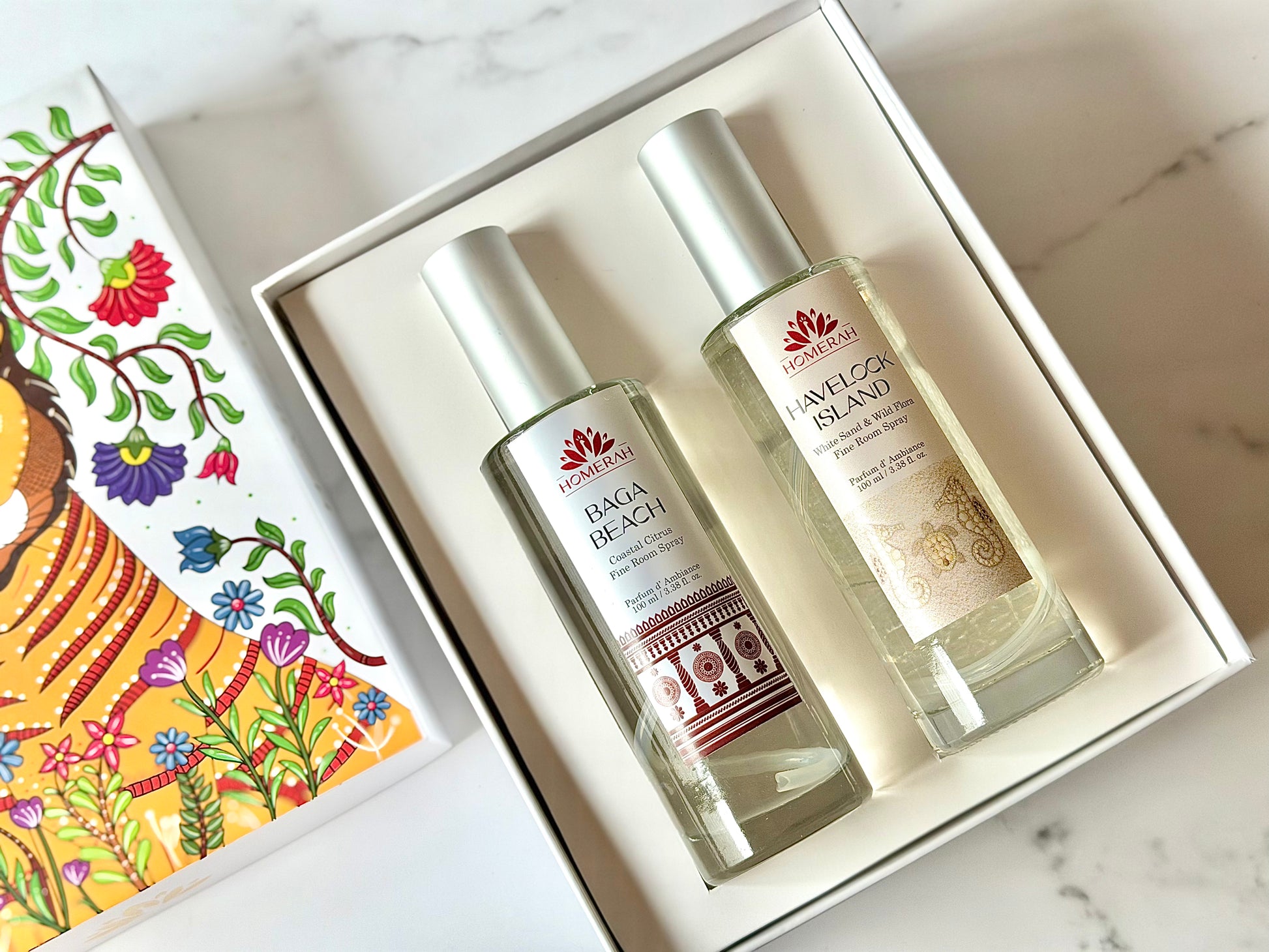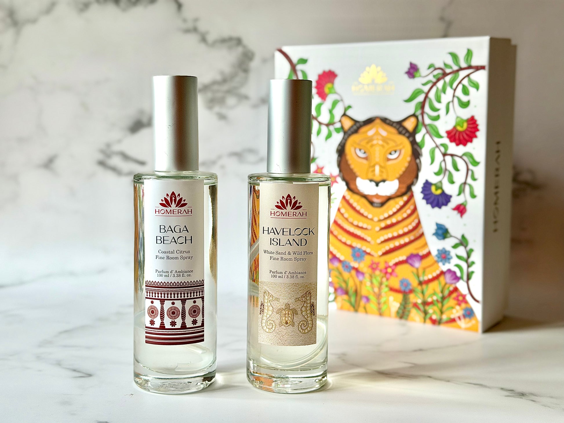 Homerah Coastal Treasure Collection In Gond Tiger Gift Box - Set of 2 Fine Room Parfums - BAGA BEACH (Costal Citrus) x1, HAVELOCK ISLAND (White Sand & Wild Flora) x1
