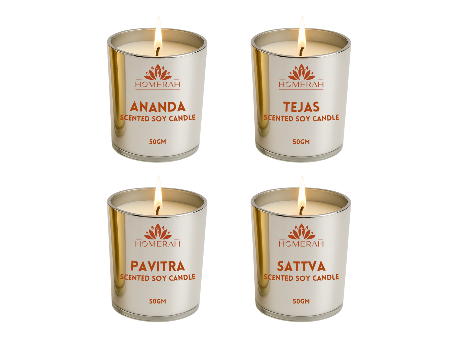 Homerah Light & Legacy Collection In Kalamkari Sea Trade Gift Box - Set of 4 Assorted Scented Soy Wax Luxury Candles - SATTVA (Lemongrass) x1, PAVITRA (Eucalyptus) x1 , TEJAS (Spices of India) x1, ANANDA (Honey & Rose) x1